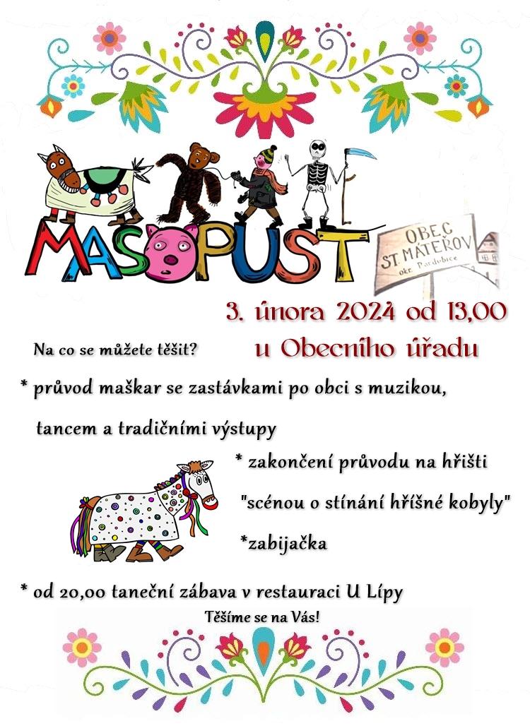 Dáváme Vám na vědomost, že se po dlouhé odmlce připojujeme k bohulibé tradici Masopustů a zveme Vás k nám do Starého Mateřova na znovuzrozenou masopustní maškaru, která se uskuteční 3.2.2024 od 13 hod